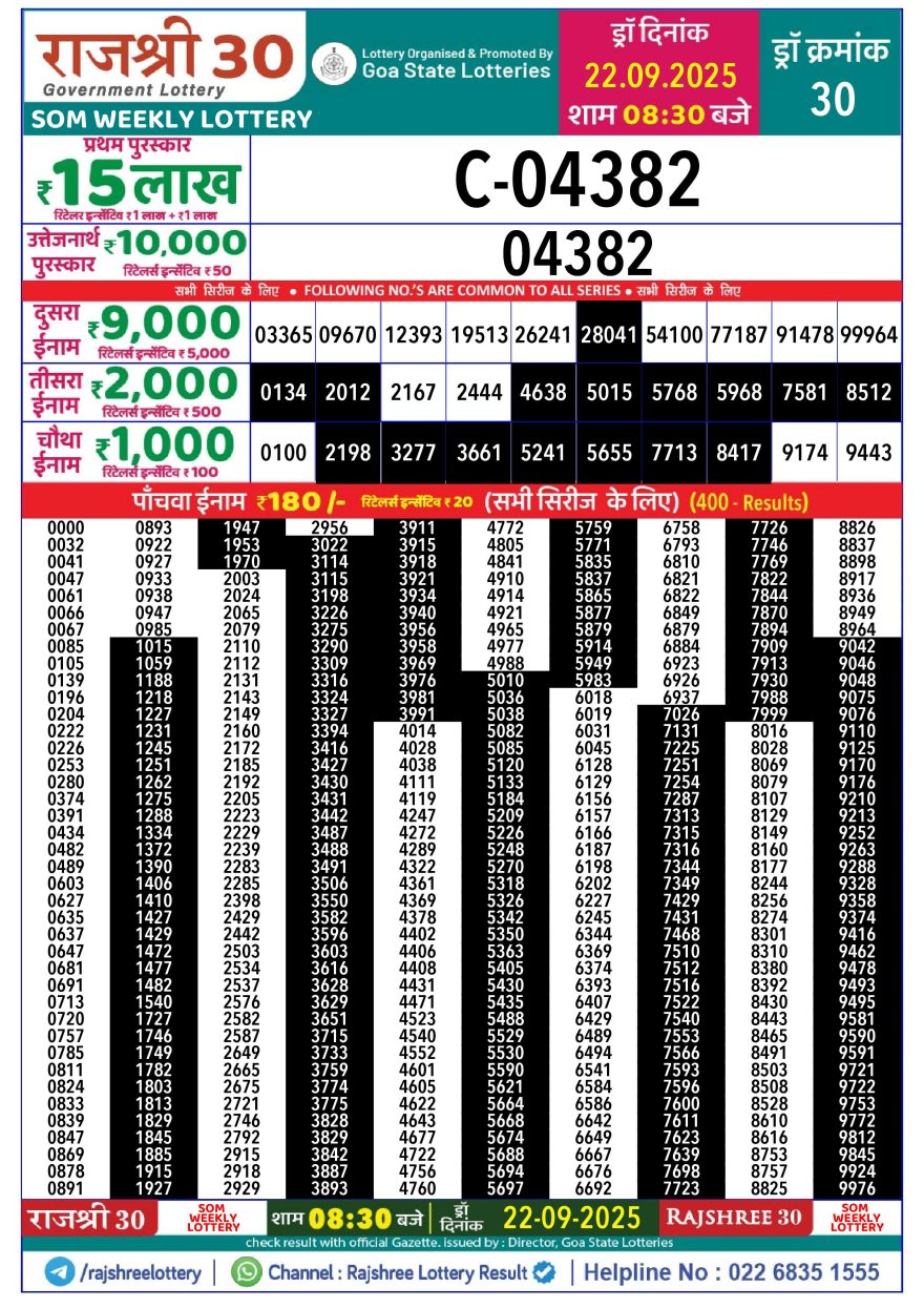 Rajshree 30 Som Weekly lottery 08.30PM 22.09.2025 Leave a Comment on Rajshree 30 Som Weekly lottery 08.30PM 22.09.2025