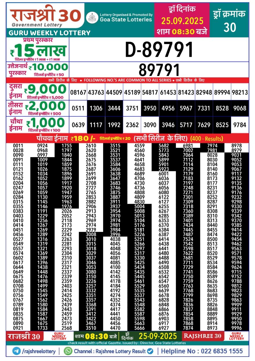 Rajshree 30 Guru Weekly lottery 08.30PM 25.09.2025 Leave a Comment on Rajshree 30 Guru Weekly lottery 08.30PM 25.09.2025