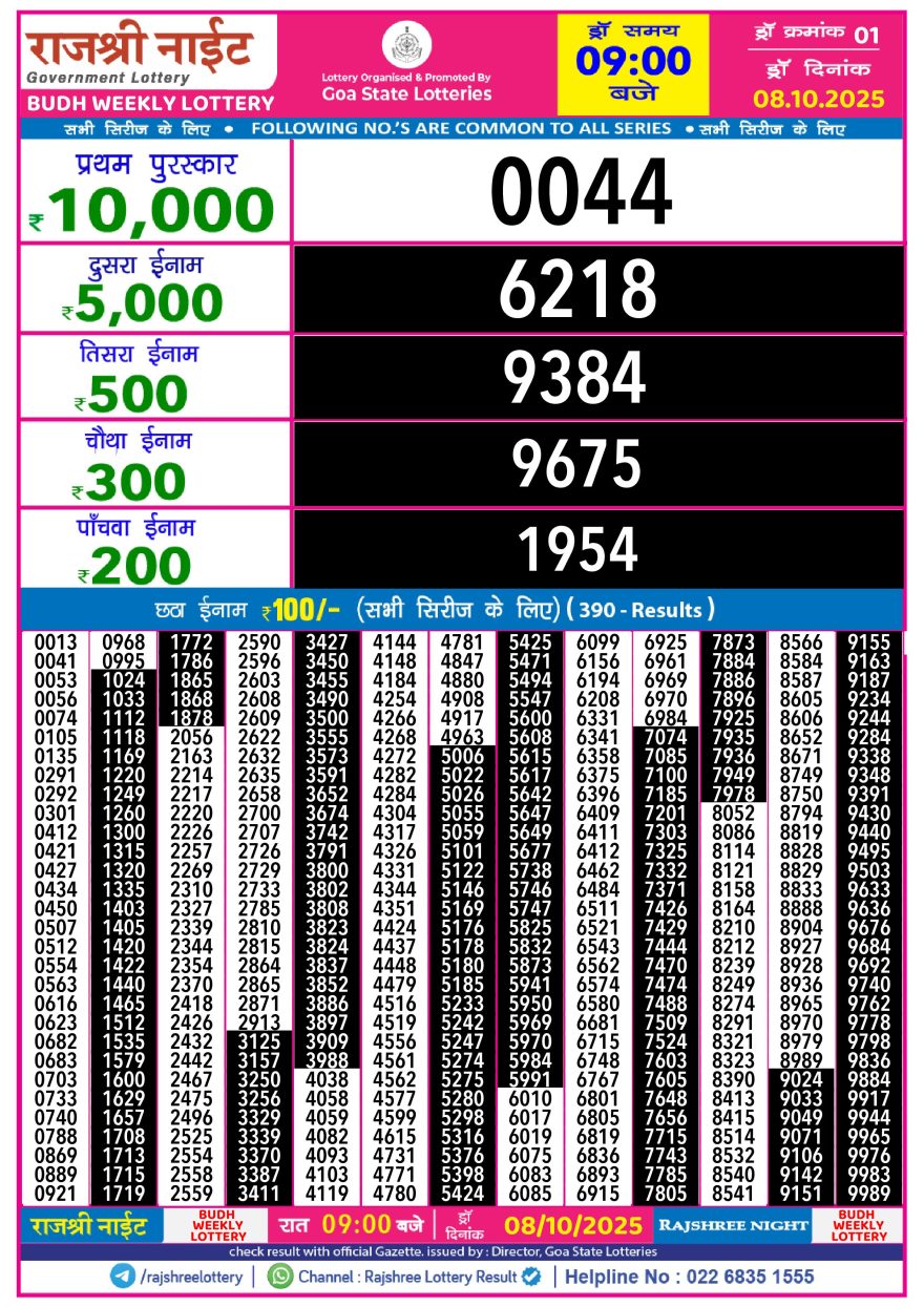 Rajshree 30 Budh Weekly lottery 09.00PM 08.10.2025 Leave a Comment on Rajshree 30 Budh Weekly lottery 09.00PM 08.10.2025