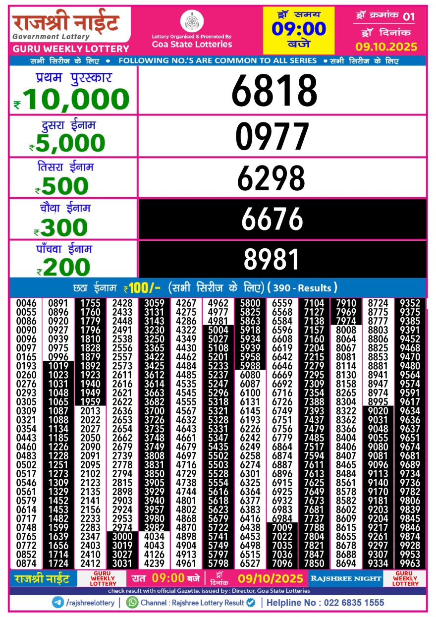Rajshree 30 Guru Weekly lottery 09.00PM 09.10.2025 Leave a Comment on Rajshree 30 Guru Weekly lottery 09.00PM 09.10.2025