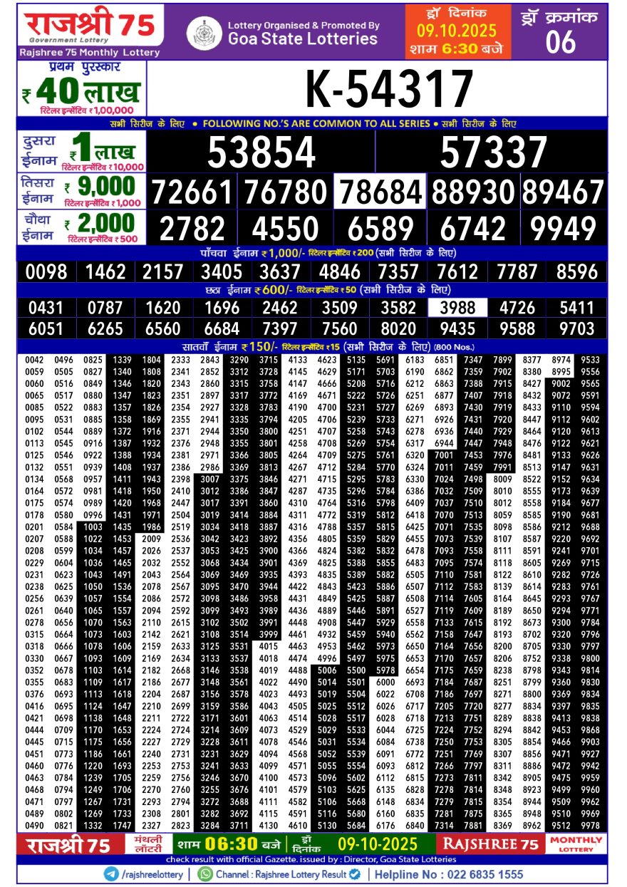 Rajshree 75 Monthly lottery 06.30PM 09.10.2025 Leave a Comment on Rajshree 75 Monthly lottery 06.30PM 09.10.2025
