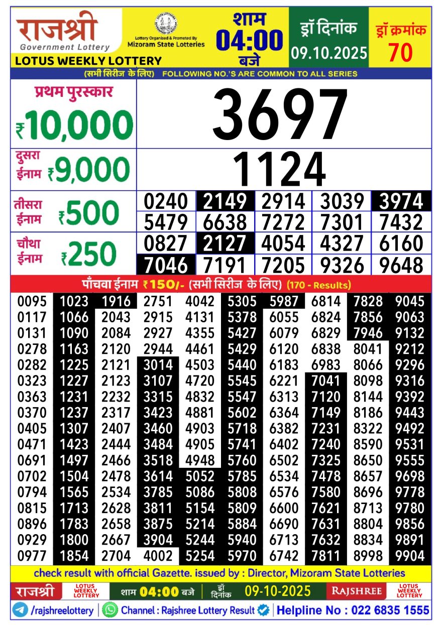 Rajshree Lotus lottery 04:00 PM 09.10.2025 Leave a Comment on Rajshree Lotus lottery 04:00 PM 09.10.2025