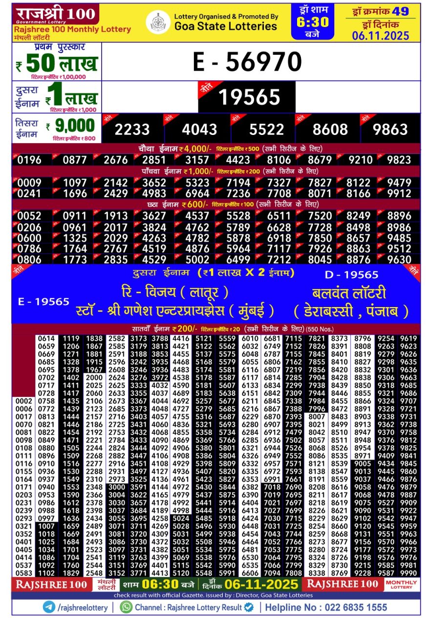 Rajshree 100 Monthly lottery 06.30 PM 06.11.2025 Leave a Comment on Rajshree 100 Monthly lottery 06.30 PM 06.11.2025