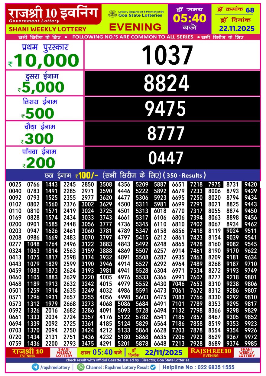 Rajshree 10 Evening lottery 05.40 PM 22.11.2025 Leave a Comment on Rajshree 10 Evening lottery 05.40 PM 22.11.2025