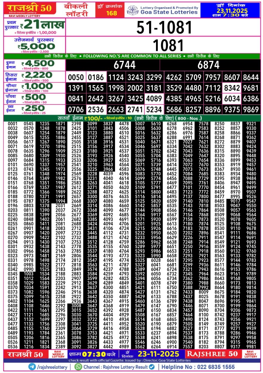 Rajshree 50 Ravi Weekly lottery 07.30PM 23.11.2025 Leave a Comment on Rajshree 50 Ravi Weekly lottery 07.30PM 23.11.2025