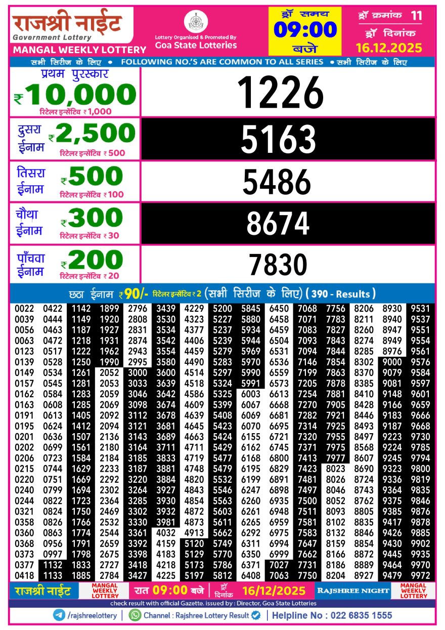 Rajshree 30 Mangal Weekly lottery 09.00PM 16.12.2025 Leave a Comment on Rajshree 30 Mangal Weekly lottery 09.00PM 16.12.2025