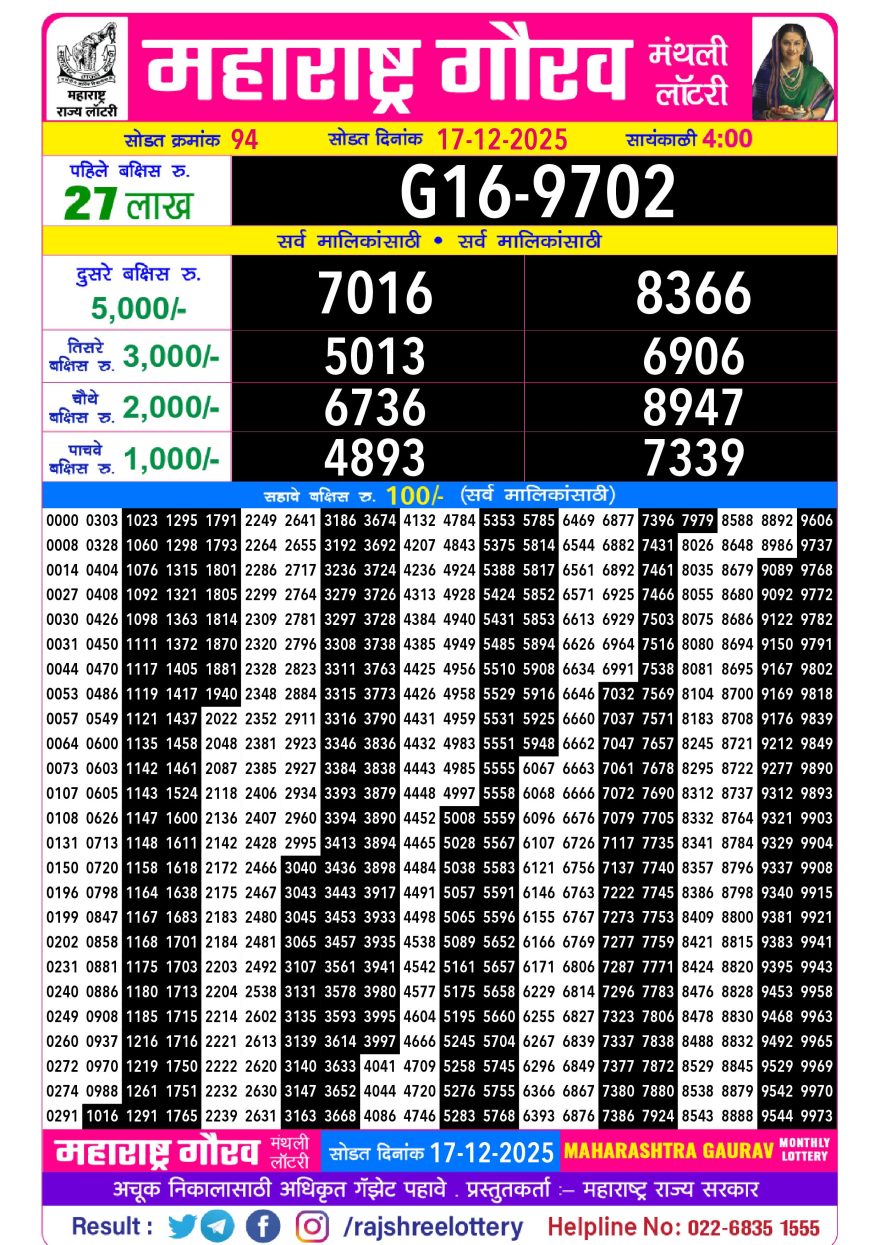 Rajshree Maharashtra Gaurav lottery 4:00 PM 17.12.2025 Leave a Comment on Rajshree Maharashtra Gaurav lottery 4:00 PM 17.12.2025