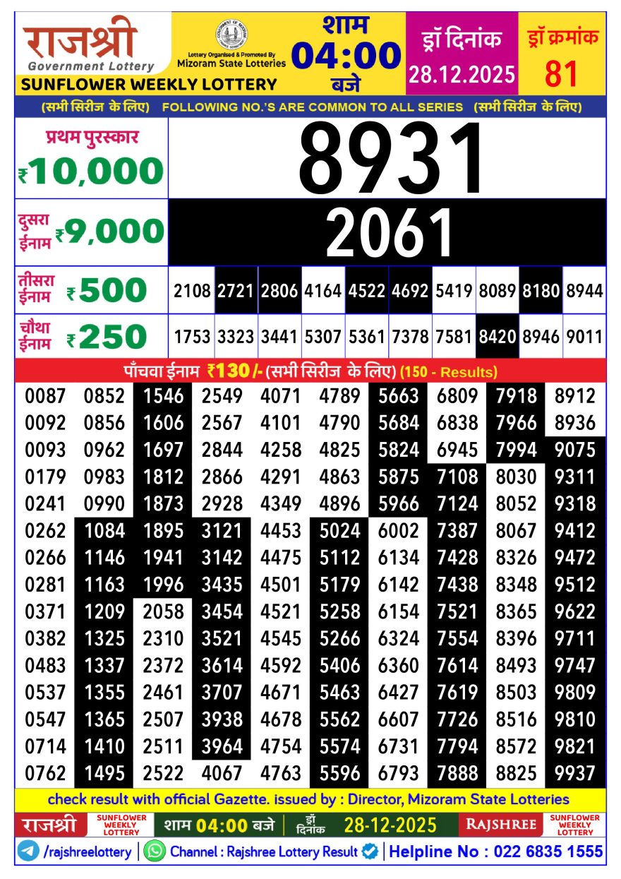Rajshree Sunflower lottery 04:00 PM 28.12.2025 Leave a Comment on Rajshree Sunflower lottery 04:00 PM 28.12.2025