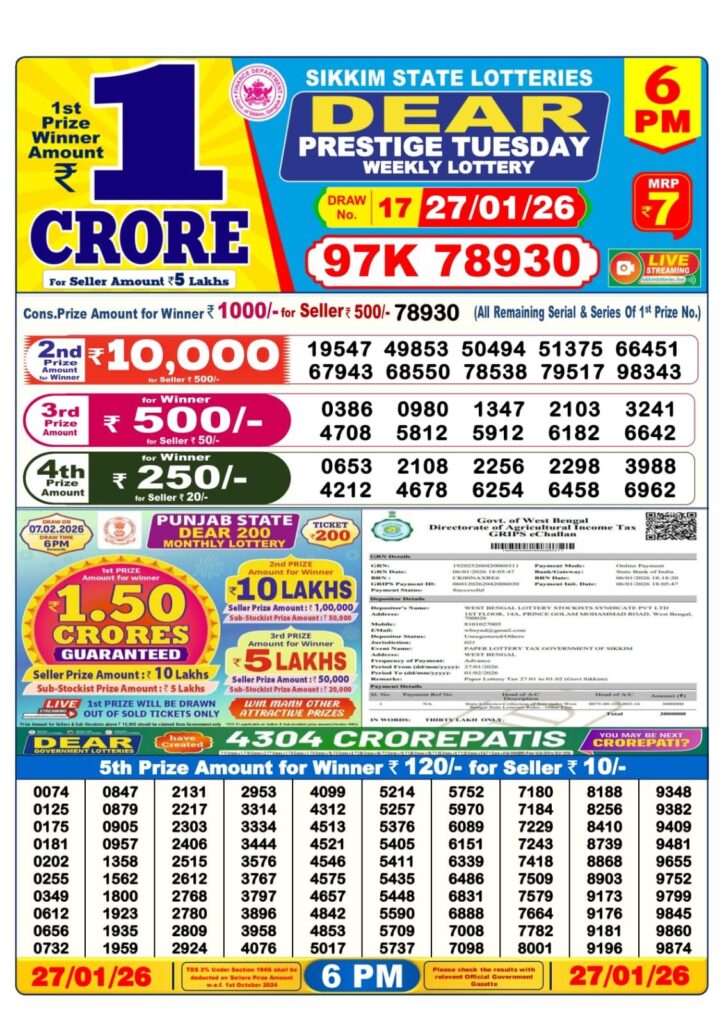 Check Full Details for this Sikkim State Tuesday weekly lottery result here of 6:00 PM.